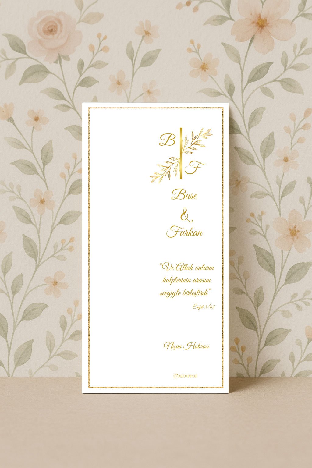 Gold monogram detaylı zarif tasarımıyla modern nişan konseptleri için özel hatıra kartı.
