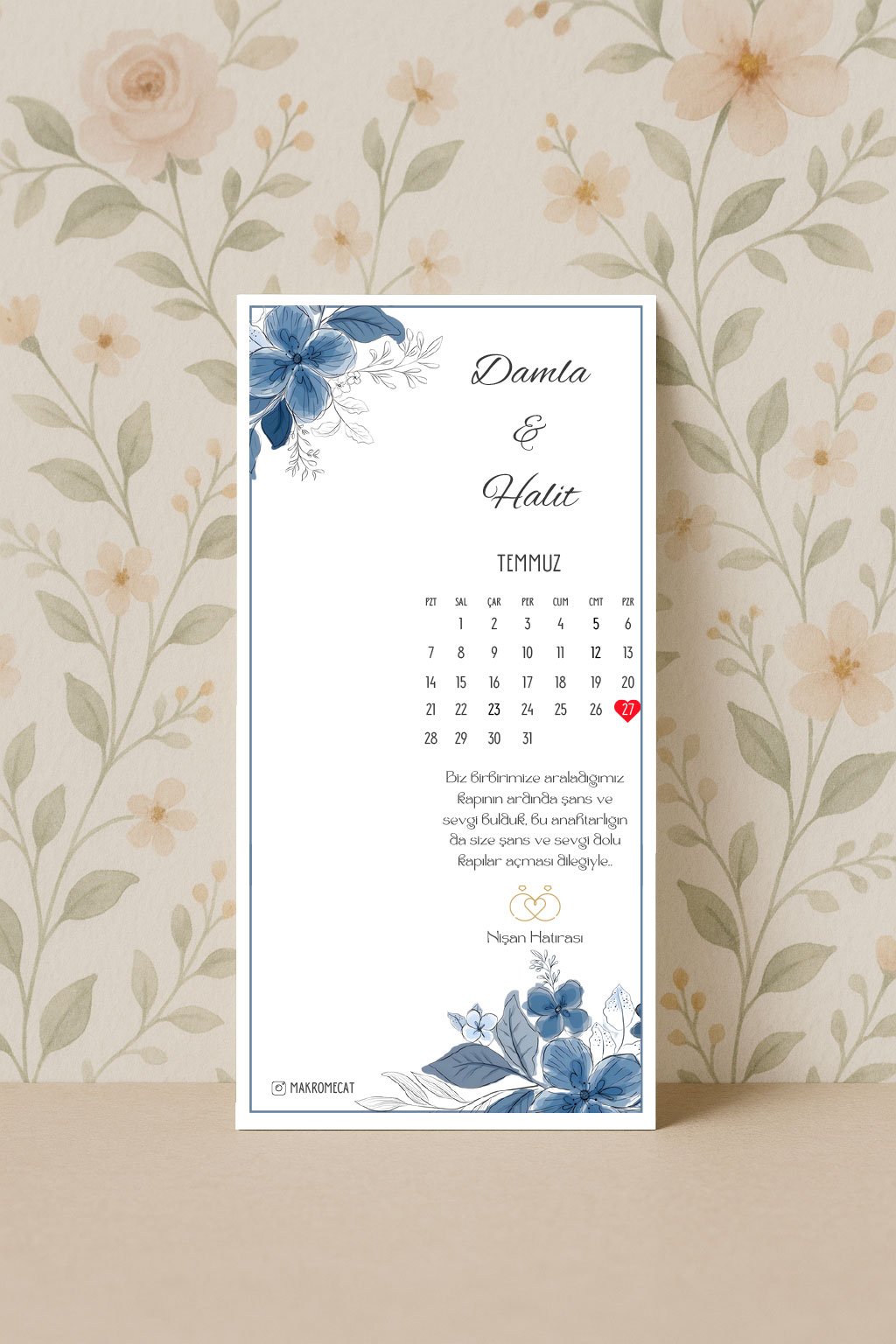 Mavi çiçek illüstrasyonlu, yaz aylarına uygun sade ve zarif nişan kartı.