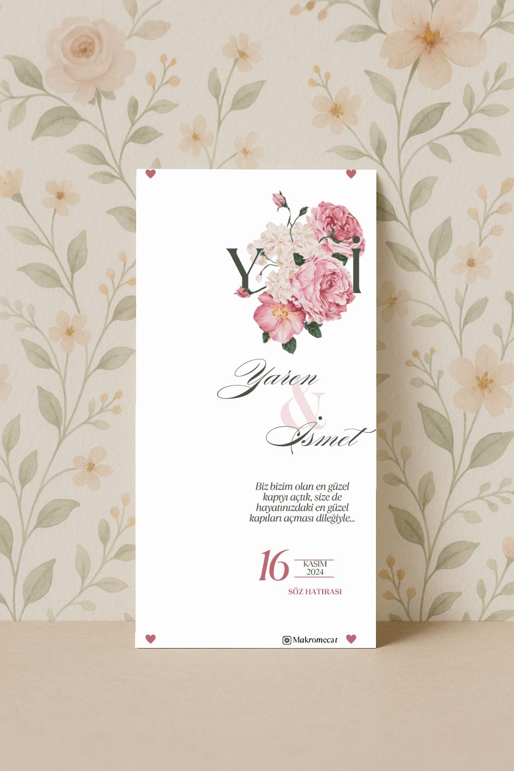 Romantik pembe çiçek buketi ve baş harf monogramlı şık söz hatırası kartı.